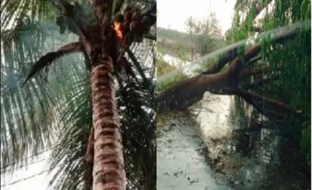 वादळी वाऱ्यासह अवकाळीचे थैमान, नारळाच्या झाडावर कोसळली वीज